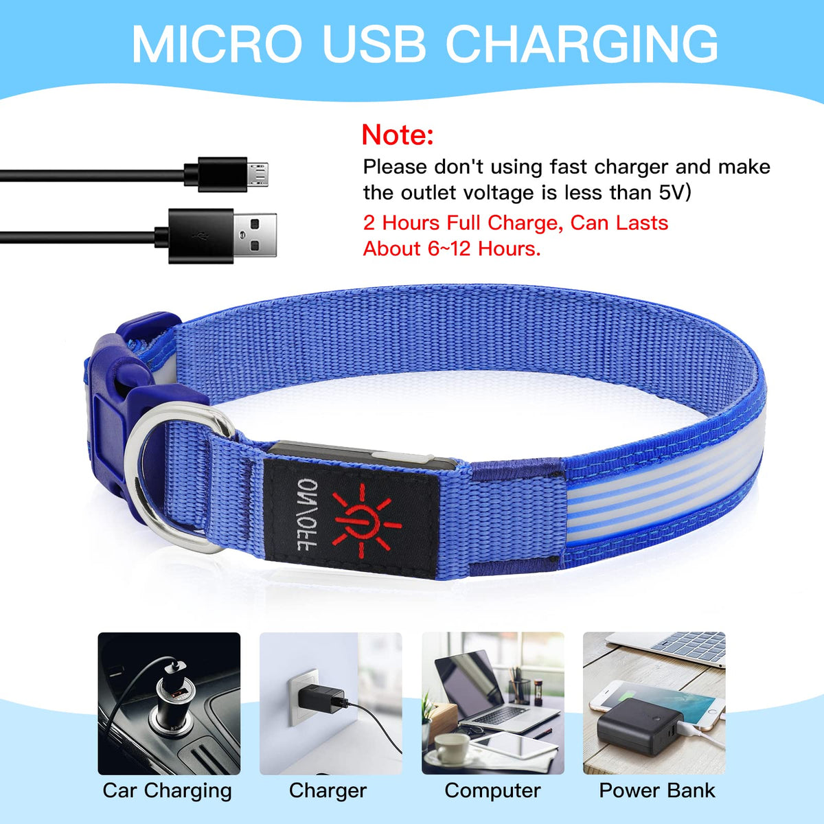 The Story Of Us:I Am A Pet Lover And Have 2 Dogs (One Jacky One Tony) And 1 Dog (Nikky). And I Have An Idea To Do Best Product For Them, Also For Your Pet.Before The Product Launches, I Will Let My Pets Try This Product To Ensure Product Quality. So You Dont Have To Worry About The Safety Of The Product, My Pets Use This Product Every Day.We Aiming At Bringing The Best Products And Services To All Pets !Are You Worried About Your Loved Pet Are Safe At Night And Frustrated Some Pet Necklace Loop Dont Fit Their Size?---Our Adjustable Sizes Item Light Up Dog Collar Can Help You Get Rid Of These Troubles!What Can You Get From Our Light Up Dog Collar?1). Specification For Light Up Dog Collar---Three Flashing Modes: Quick Flashing-Slow Flashing-Stable Glow-Off, Changing The Flash Modes Just By Click The Button On The Batter Case.---Three Available Color Options: Red, Green, Pink, Blue.---Size: Samll:26.6~35.5Cm, Medium: 35.5~52Cm, Large:43.2~65Cm.2) Package Including For Light Up Dog Collar---1X Light Up Dog Collar---1X Usb Charge Cabletips Of How To Use This Light Up Dog Collar? 1. Youd Better Get It Be Fully Charged After First Use Up Of The Battery, Which Will Promote The Service Life Of The Battery For Collar.2. Measuring The Length Of Your Dogs, And Adjust The Buckle Of The Collar And Let It Fit Your Pets, And Fixed It.3. Choose The Flash Mode That You Need, And Turn It Off When Not Needed. Warning:1.Choking Hazard Small Parts, Not For Children Under 3 Years Old.2.Fast Charge Adapter May Cause Serious Damage. Charging With 5V Usb Adapter Only.3.The Color Of The Picture May Vary Depending On The Display. Please Refer To The Actual Object.
