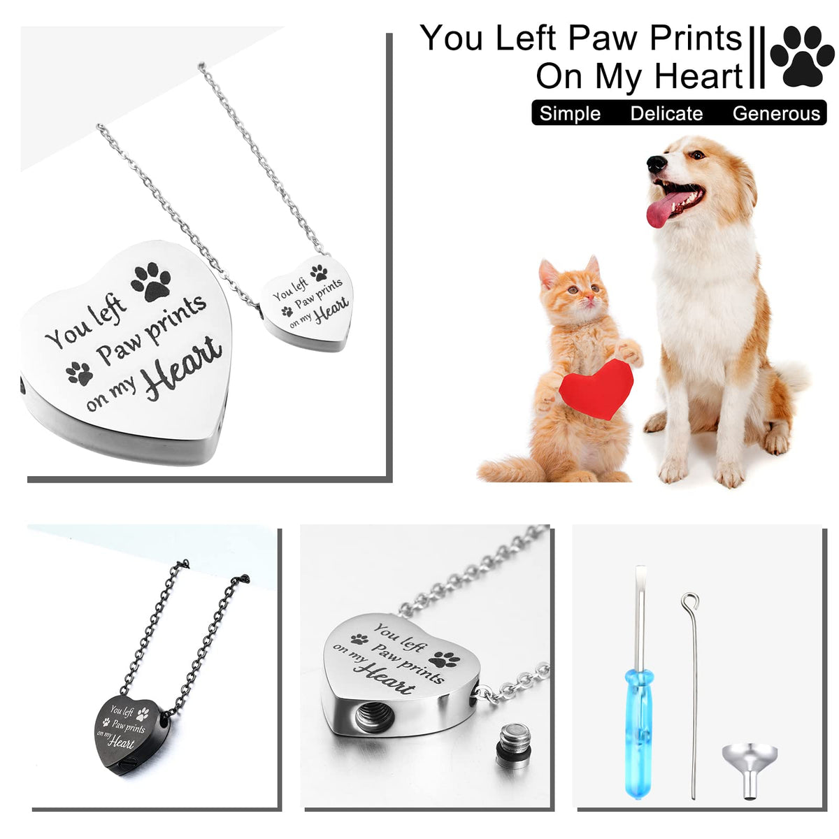 Yinkin 2 Pcs Pet Cremation Jewelry For Ashes Urn Necklace With Paw Print Heart, Pet Dog Necklace Stainless Steel Pendant Black And Silver Urn Locket With Funnel Kit For Dog Cat Ashes