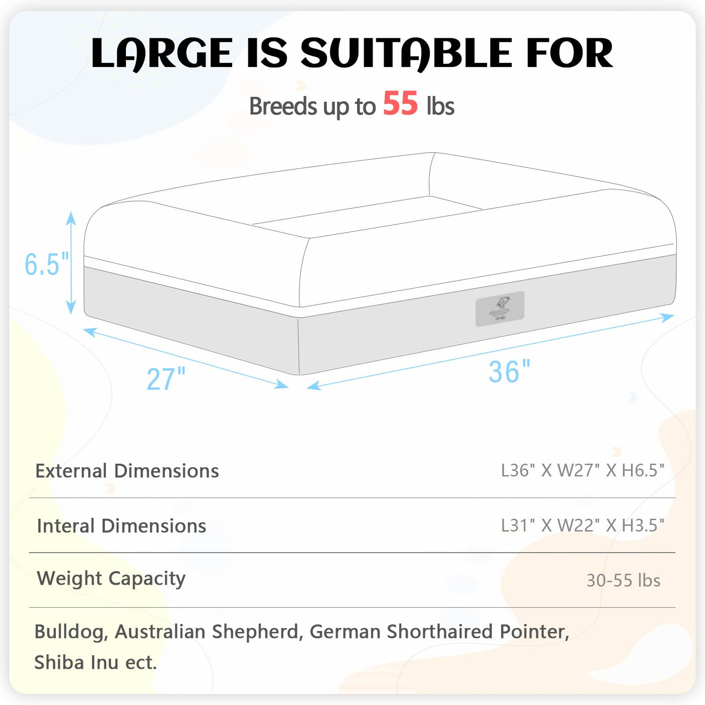 Q: Is the Yiruka Dog Bed suitable for large dogs?A: Yes, this bed is specifically designed for large dogs, with dimensions of 36.0"L x 27.0"W x 6.5"Th, providing ample space for your furry friend to stretch out comfortably.