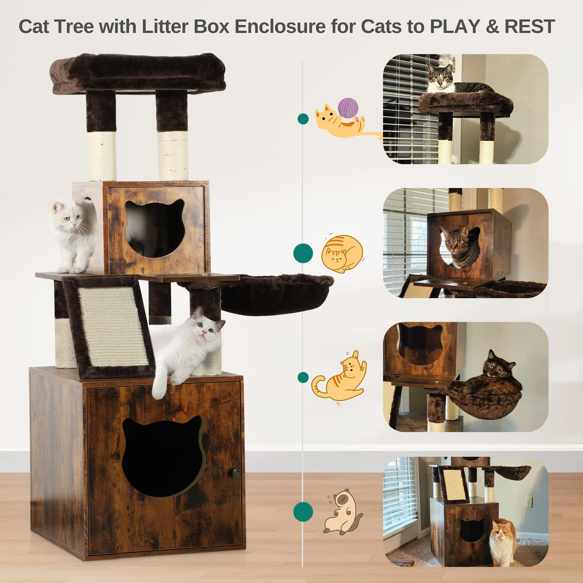 Yitahome Cat Tree With Litter Box Enclosure, Hidden Cat Litter Box Furniture With Sisal Scratching Post, Wooden Cat House With B
