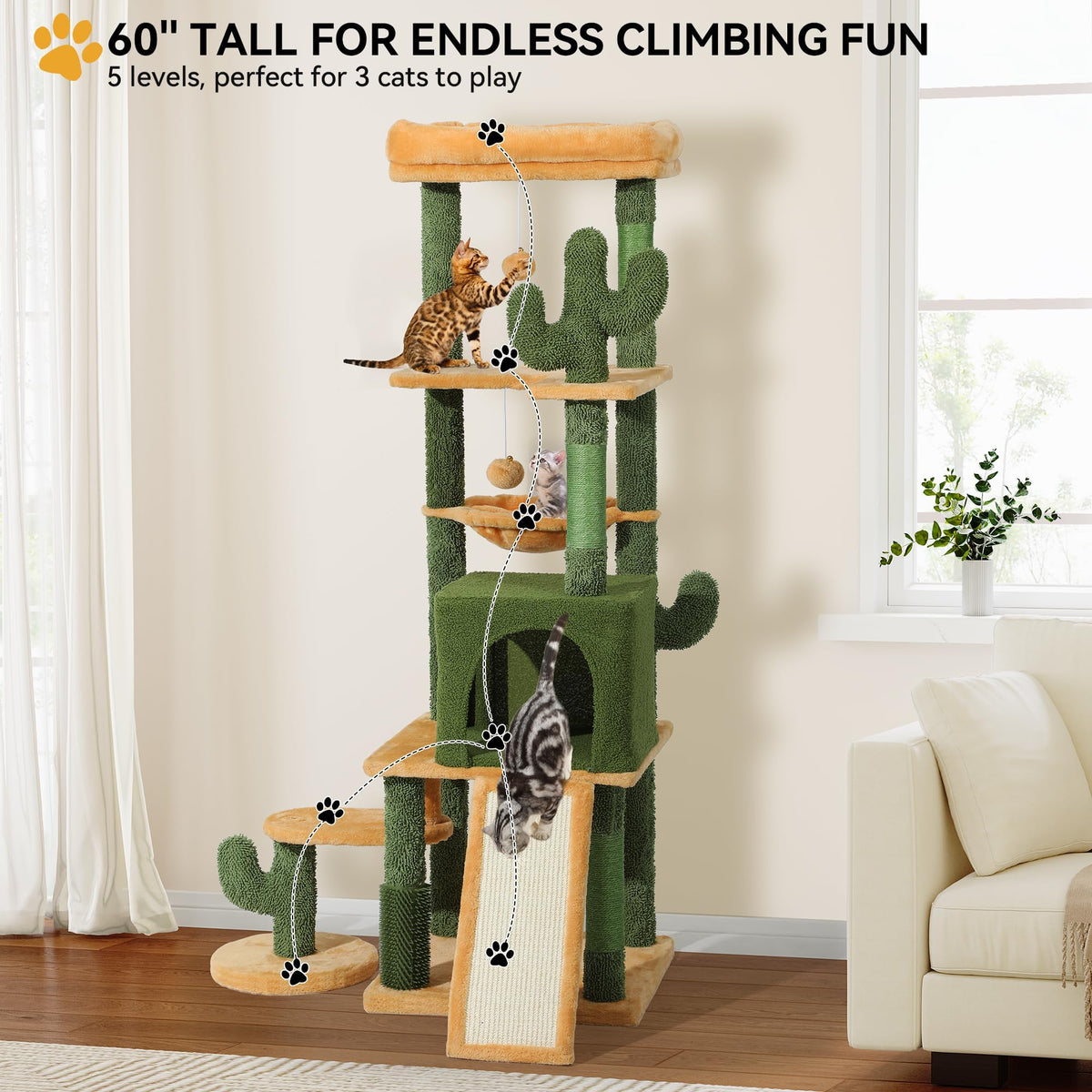 Yitahome Tall Cactus Cat Tree Tower With Self-Grooming Brush, 60In Cute Cat Climbing Tower For Indoor Cats With Cat Condo, Top P