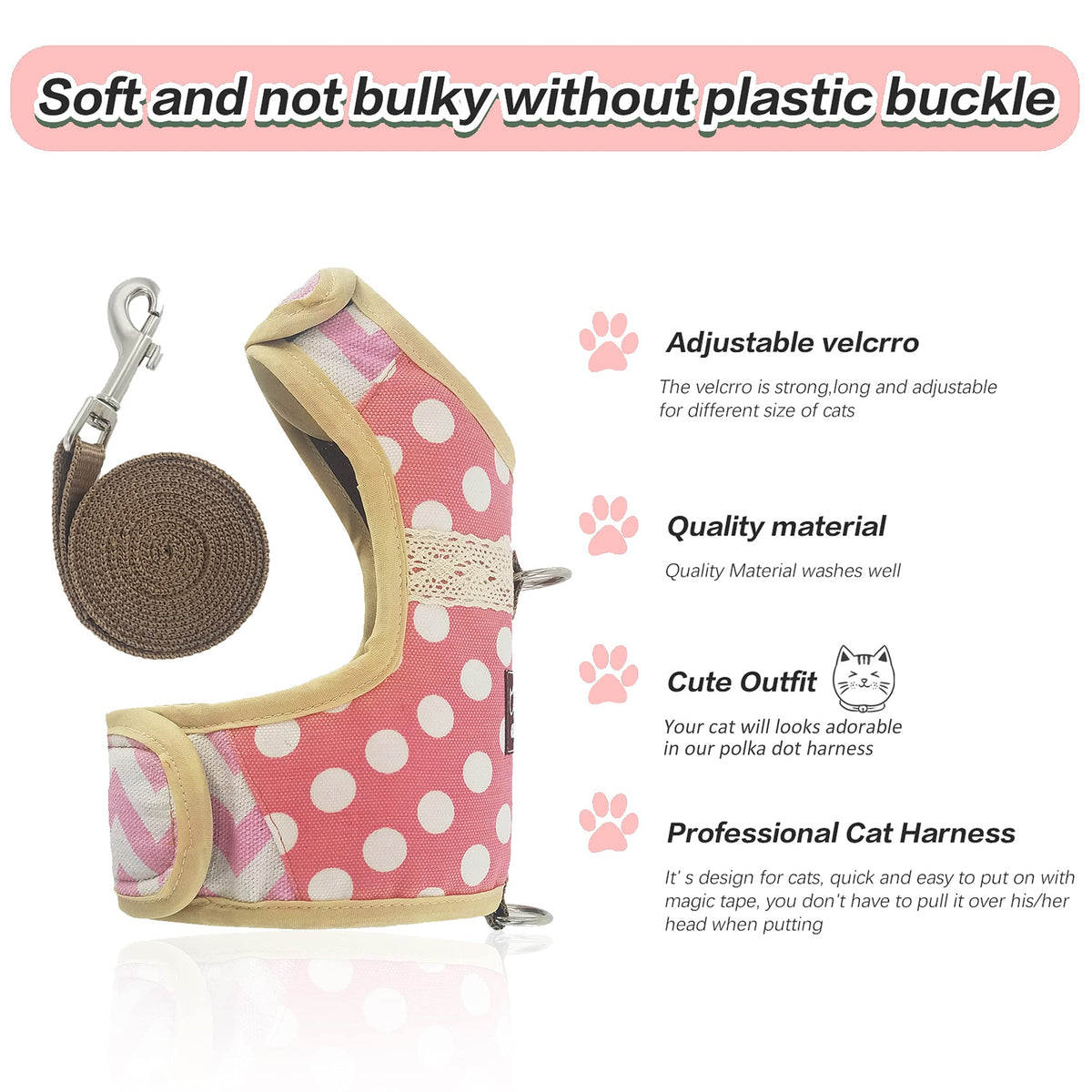 Yizhi Miaow Cat Harness And Leash For Walking Escape Proof, Adjustable Cat Vest Harness, Padded Stylish Cat Walking Jackets, Polka Dot Pink, Small