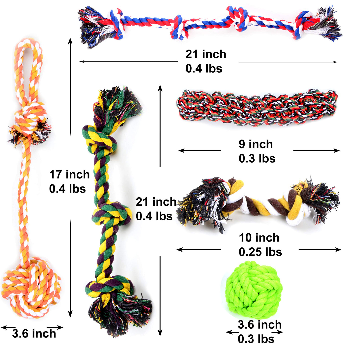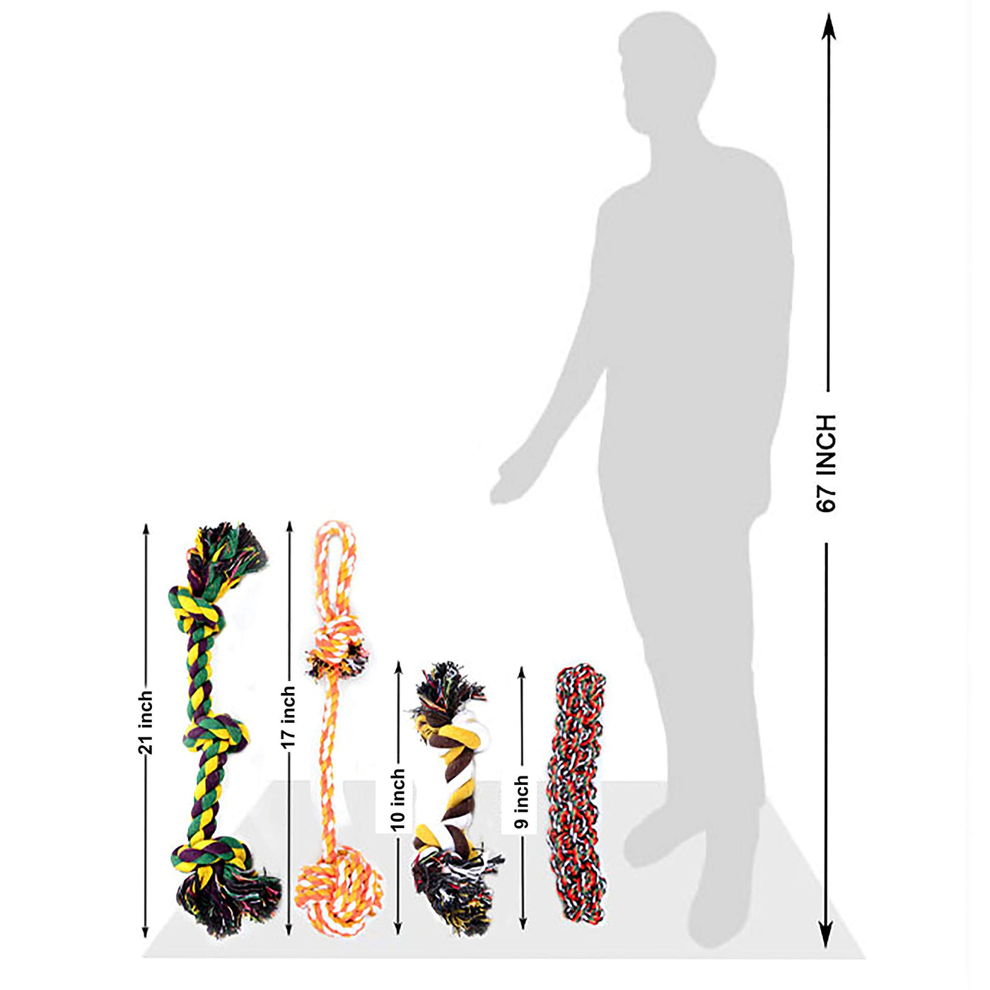 Q: What types of toys are included in the 6-pack set?A: The 6-pack set includes a variety of rope toys, such as a 2 feet 4 knots rope, a 3 knots rope, a 2 knots rope, a 4-inch rope ball, a handle rope with an attached ball, and a 16-inch braided corn stick.