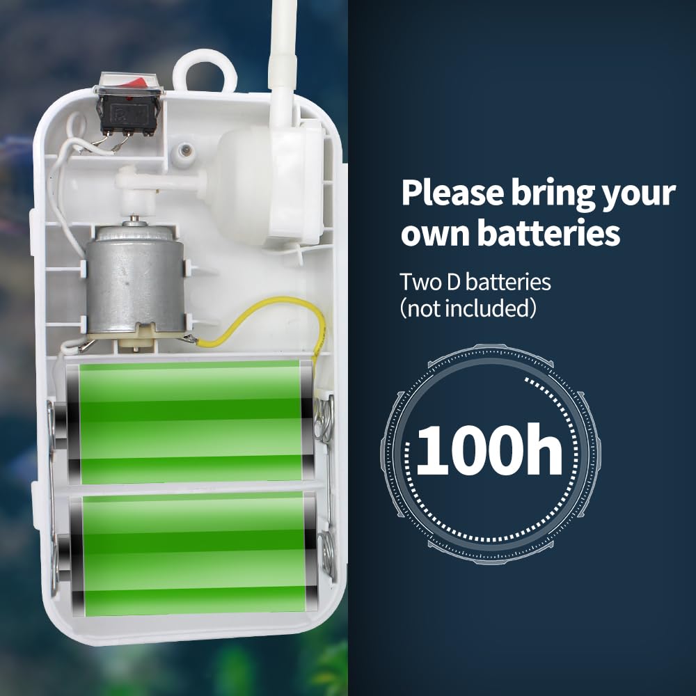 Air Pump x1 Air stone and hose included x1 Only 2 D-sized batteries can power for over 100 hours Waterproof switch