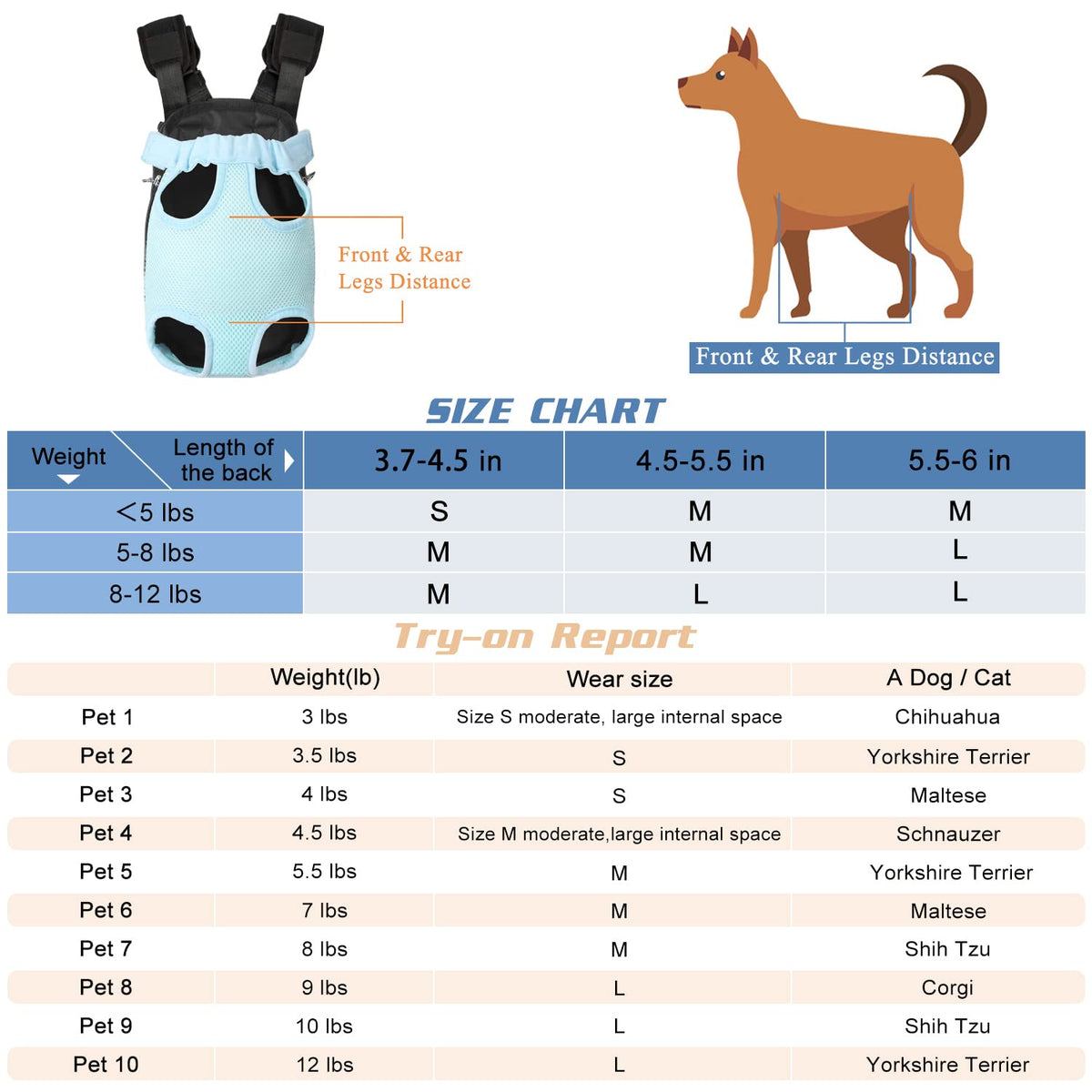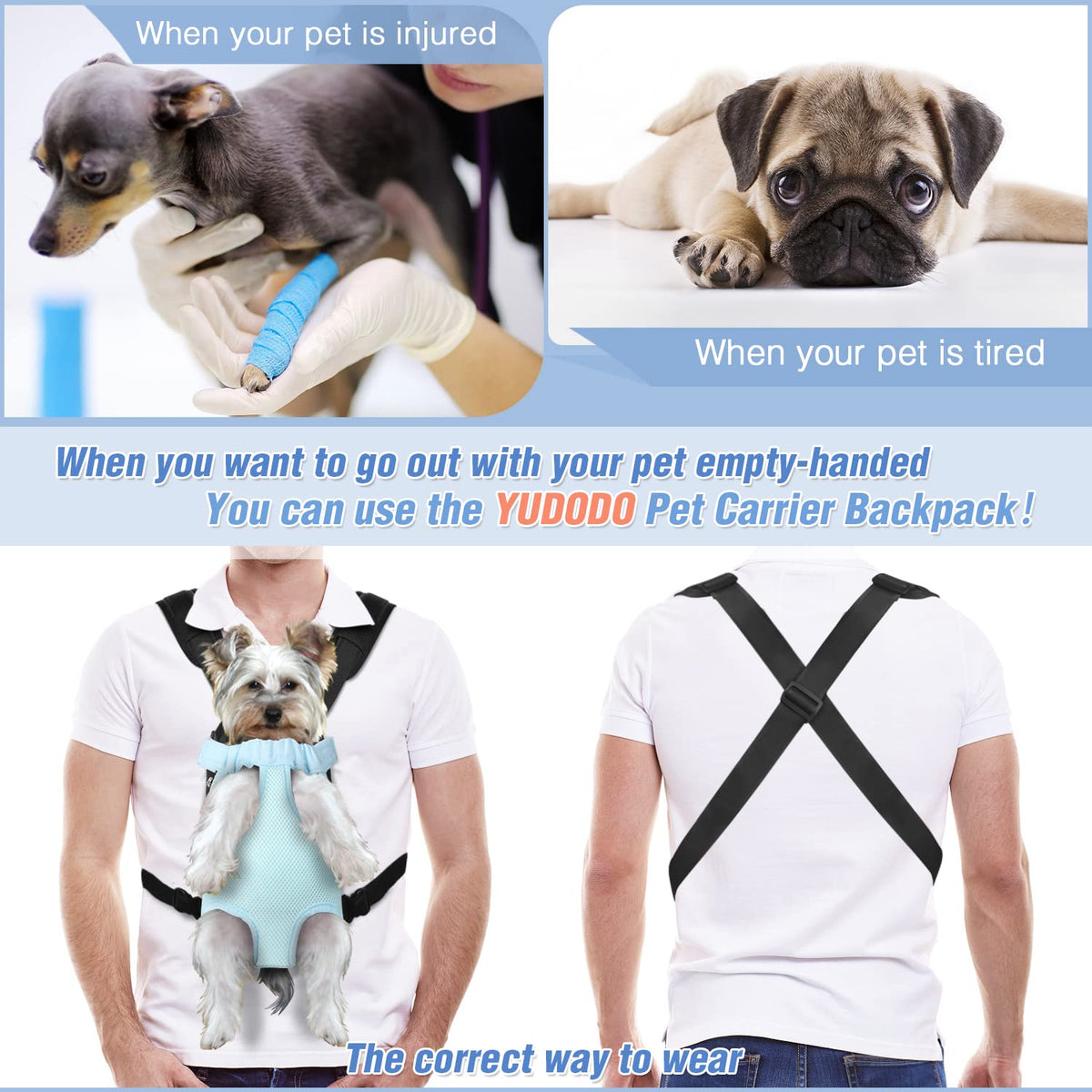 Providing Better care for Pets: YUDODO Pet is dedicated to offering small pets a more comfortable outdoor experience This front pet dog backpack carrier allows you to keep your hands free while keeping your dog in your line of sight ensuring your pets safety and comfort Suitable for Pets Under 12 lbs: The YUDODO dog front carrier is designed for small to medium-sized dogs and cats We highly recommend it for pets weighing less than 12 lbs as larger dogs may cause discomfort for the owner due to increased weight 3 Sizes Available for Your Beloved Pet: The suggested weight for the dog front backpack is for reference only If your dogs body length requires size S but the girth requires size M please choose size M Additionally leave at least an extra inch to ensure your pets comfort Safe and Fashionable Design: The breathable mesh material provides your dog with warmth in winter and keeps them cool in summer Adjustable wide straps with an elastic neck design in the dog front backpack carrier offer ample flexibility and comfort A built-in safety lock ensures your pets stay secure and prevent them from flopping Travel with Your Pets: Our lightweight dog front carrier backpack allows you to travel with your pet without feeling burdened Whether its biking hiking camping or other activities you can comfortably carry your small dogs or cats Plus it provides opportunities to capture fun moments and share them with your friends