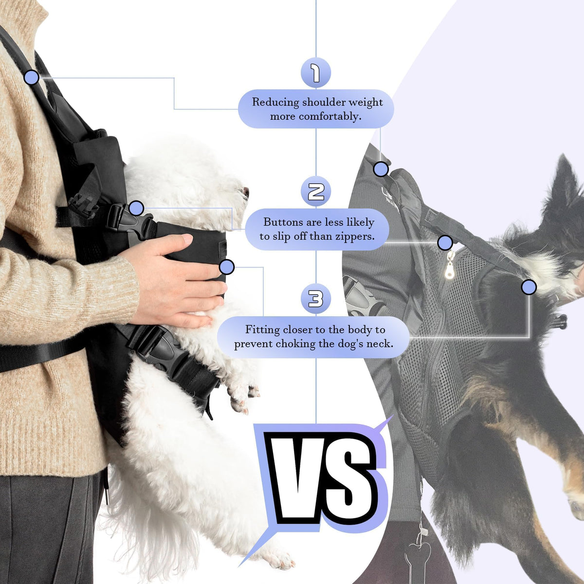 Secure and Safe Carrying Experience: Safety is our priority. This carrier features an interior safety strap with a buckle to prevent your pet from jumping out, along with secure zippers and adjustable leg and tail holes. It ensures a snug and stable fit?perfect for active pets or bumpy rides.