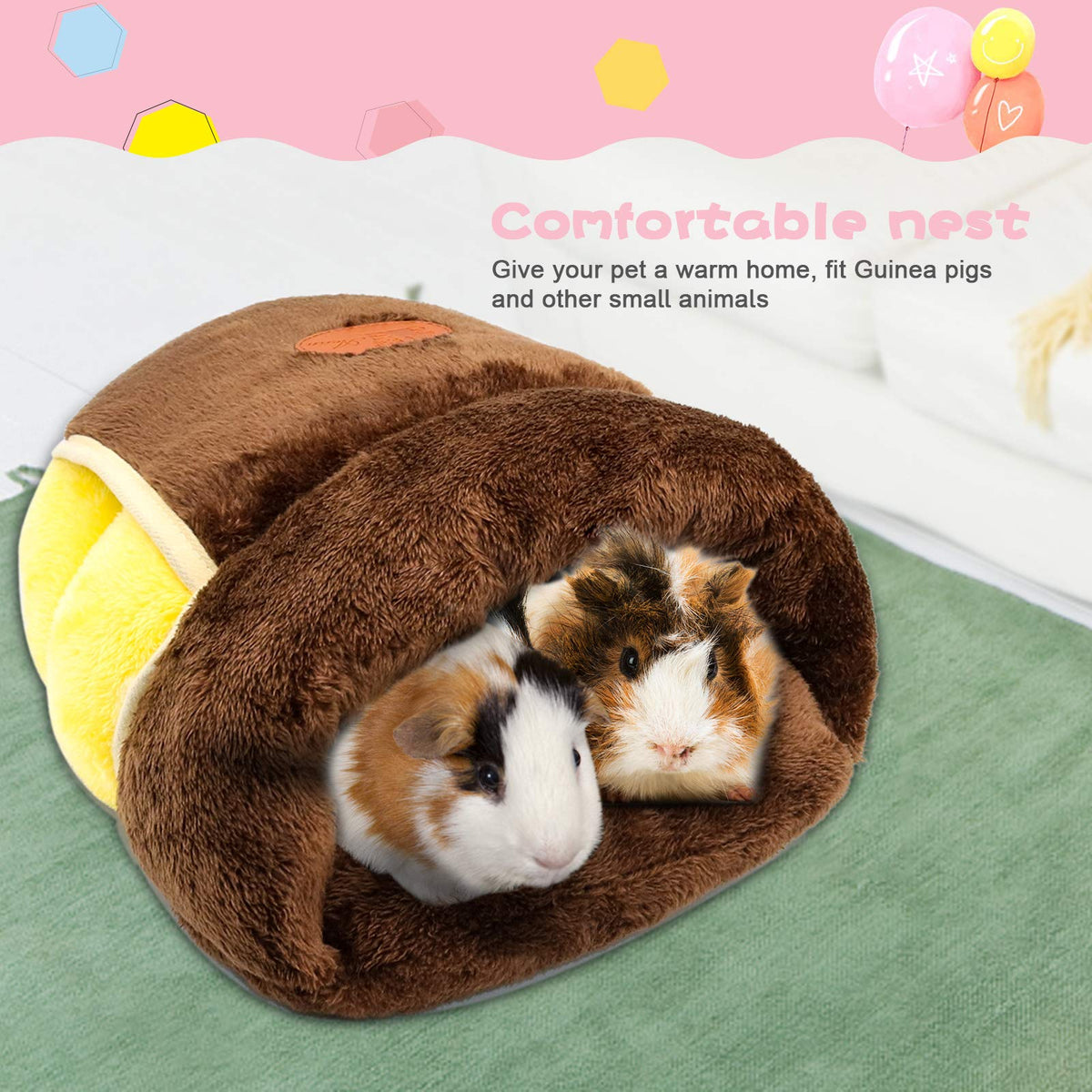 Yuepet Bed Houses Focus On Small Animals ,All Designed To Try To Give Them More Attention. They Are Much More Sensitive And Need More Care Than Other Bigger Pets. Choosing The Best Cage Bedding Is Very Helpful For Their Happy Daily Life. Small Animals Require A Safe Place To Sleep Or Nap, Preferably One That Is Quite And Warm, Proper Bedding Materials Can Help To Reduce Stress And Increase The Quality Of Sleep Your Pet Is Getting, All While Optimizing Their Health. Main Feature: Wide Entrance Design Provides Access Easily. Super Soft, Warm And Comfortable. Ideal For Guinea Pigs, Rabbits, Bunnies,Ferrets, Chinchillas, Degus, And Other Small Pet. Big Enough For 2 Guinea Pigs. Measurement:7.48' Tall X 14.5' Long X 11.4'. Package Included: 1 X Small Animal Fleece Hideout