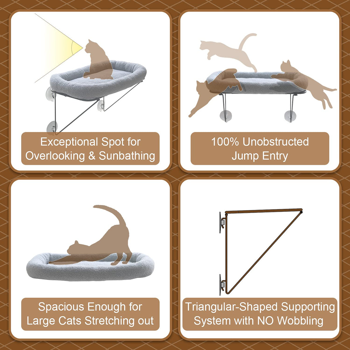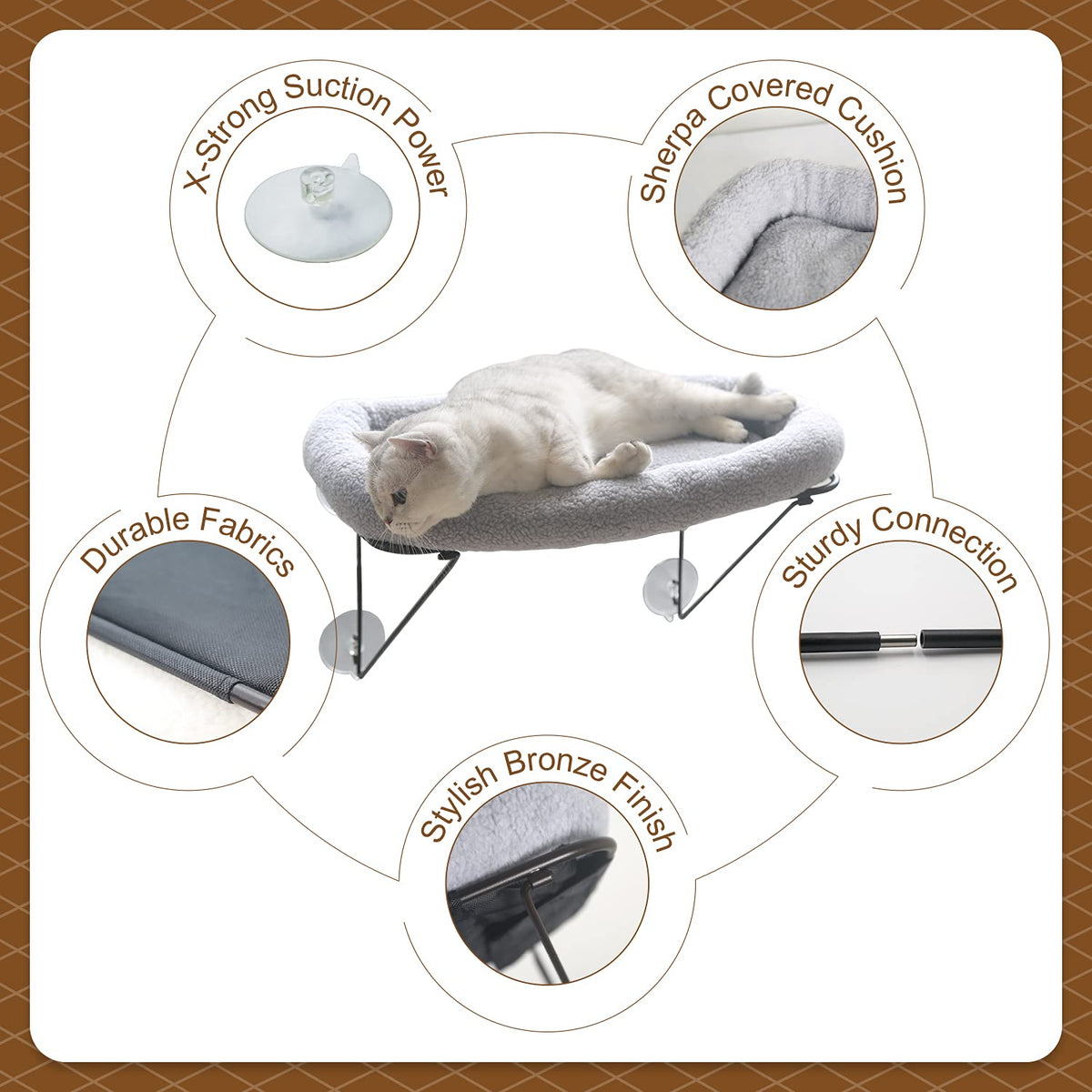 Why Zakkart Cats Love Being Up High To Overlook Surroundings, Soak Up The Direct Sunlight And Take Naps Zakkart Cat Window Bed Is The Perfect Item For This 1 Sturdier Structure A Supported By A Pair Of Triangular-Shaped Metal Arms Underneath The Perch That Holds Up To 40 Lbs With No Wobbling, A Much Stabler Structure Thru Multiple Tests B 100% Unobstructed Jump Entry For Cats & Take Full Advantage Of The Space As No Wires In Their Way C No Biting On The Cord & No Risk Of Legstails Getting Stuck D Your View Out The Window Is Much Less Obstructed 2 Material & Style A 100% Made Of Iron With Stylish Bronze Finish, Durable And Reliable B Powerful Extra-Large Suction Cups For Heavy Duty, With An Additional Cup For Backup C Our Cat Window Shelf Could Be A Decorative In Addition To Your Lovely Home 3 Accessories A Comes With A Tailored 35-Inch-Thick Pet Bed, Stuffed With Cotton And Covered With Sherpa Great Texture, Soft And Warm B Everything Is Taken Care Of For You No Need To Prepare Anything Else Specifications Color: Dark Bronze Frame + Grey Bed Suction Power: Hold Up To 40 Lbs Cat Perch Frame Dimensions: 23 X 13 X 125 (L X W X H) Cat Perch Bed Dimensions: 25 X 14 X 35 (L X W X H) Weight: 4 Lbs Minimum Window Size: 22 X 125
