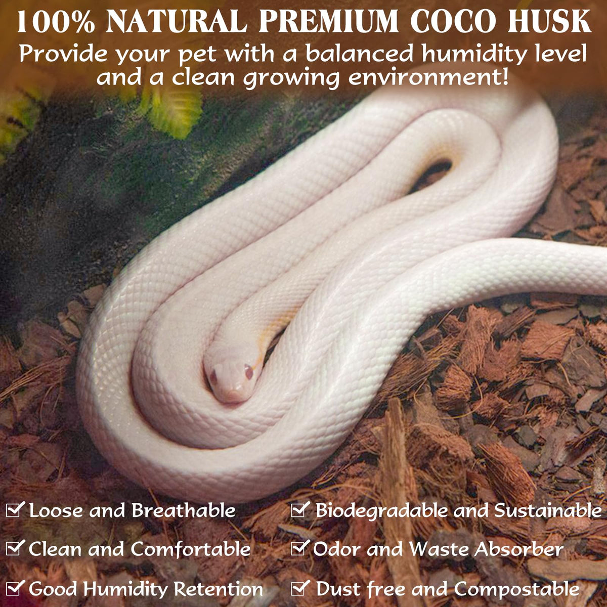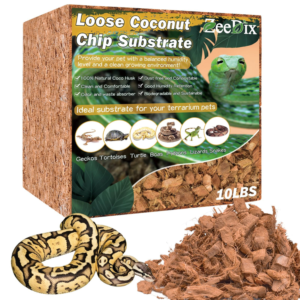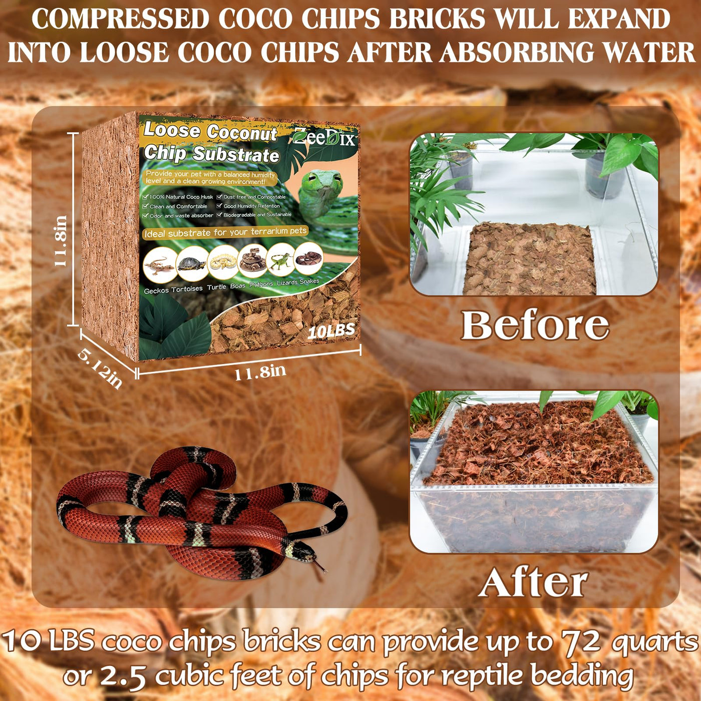 Coconut chips are ideal bedding for reptile! Specification:1)Packing: 1 pcs.2)Size: 11.8 x 5.12 x 11.8inches(L x W x H).3) Material: coco husk4) Instructions for use:-Put coco husk chips in a large container-Add appropriate water to soak and expand-Speed up its decomposition and expansion through the mixing of tools. -Then you can use it as bedding for reptilesFeatures: natural and organic, loose and breathable, clean and comfortable, dust free and compostable, biodegradable and sustainableApplication: These coco coir chip is ideal substrate for reptiles like snakes, frogs, lizards, turtles, tarantulas,etc