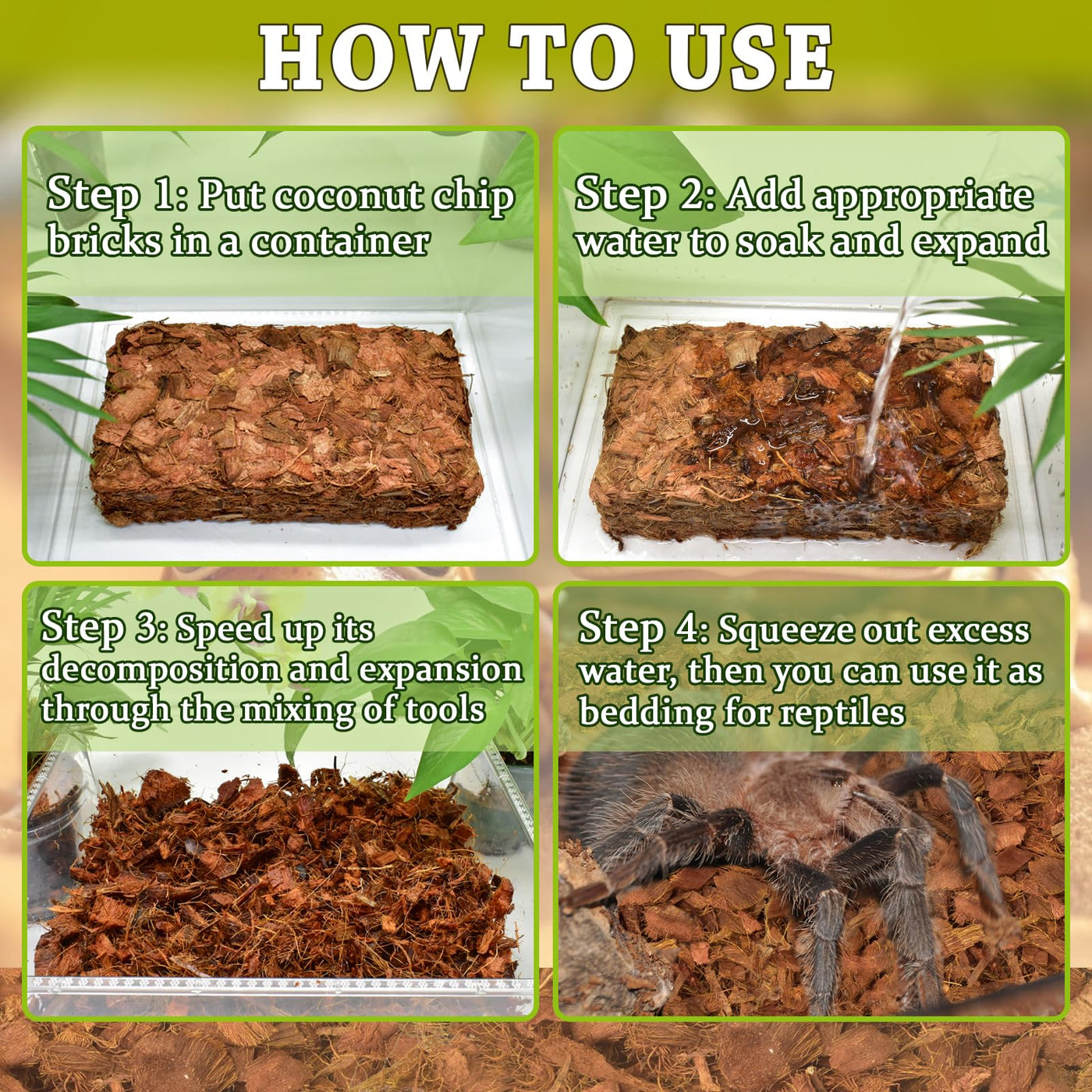 Zeedix Premium Compressed Coconut Husk Chips: 100% Natural & Sustainable, Low Ec & Ph Balance, Chemical Free. Coconut Chips Are An Ideal Habitat Substrate For Reptiles, Amphibians, Burrowing Animals And Invertebrates, And Can Also Help Plants Retain Water And Suppress Weeds.Packaging And Specifications: Our Coco Chips Are Made Of Natural Ripe Coconut Shells Compressed Into A Brick Shape, Which Does Not Take Up Much Space For Your Storage And Use. Our Coconut Fiber Substrate Is Available In 1 Piece, 3 Pieces, 6 Pieces, 10 Pieces To Meet Your Different Specifications!Directions: You Need To Put The Coco Husk Chips Brick In A Large Container, Then Add The Right Amount Of Water, Wait Until You Are Satisfied With The Expansion, Squeeze Out The Excess Water, And Then You Can Use It As A Reptile Bedding Or Plant Mulch.Widely Used: Coco Coir Chip Brick Are An Ideal Substrate For Reptiles, And Their Excellent Moisture And Breathability Can Create A Comfortable Environment For Reptiles. Coconut Chips Can Also Be Used As Mulch For Indoor And Outdoor Plants. Please Never Throw Away Your Used Coconut Chips That Can Be Composted To A Garden Bed Without Any Waste!Odor And Waste Absorber: The Coconut Fiber Substrate Has Good Moisture And Breathable Properties, Which Can Efficiently Absorb Liquids And Waste, Reduce Pungent Odors, And Create A Moist And Clean Reptile Tank Environment.