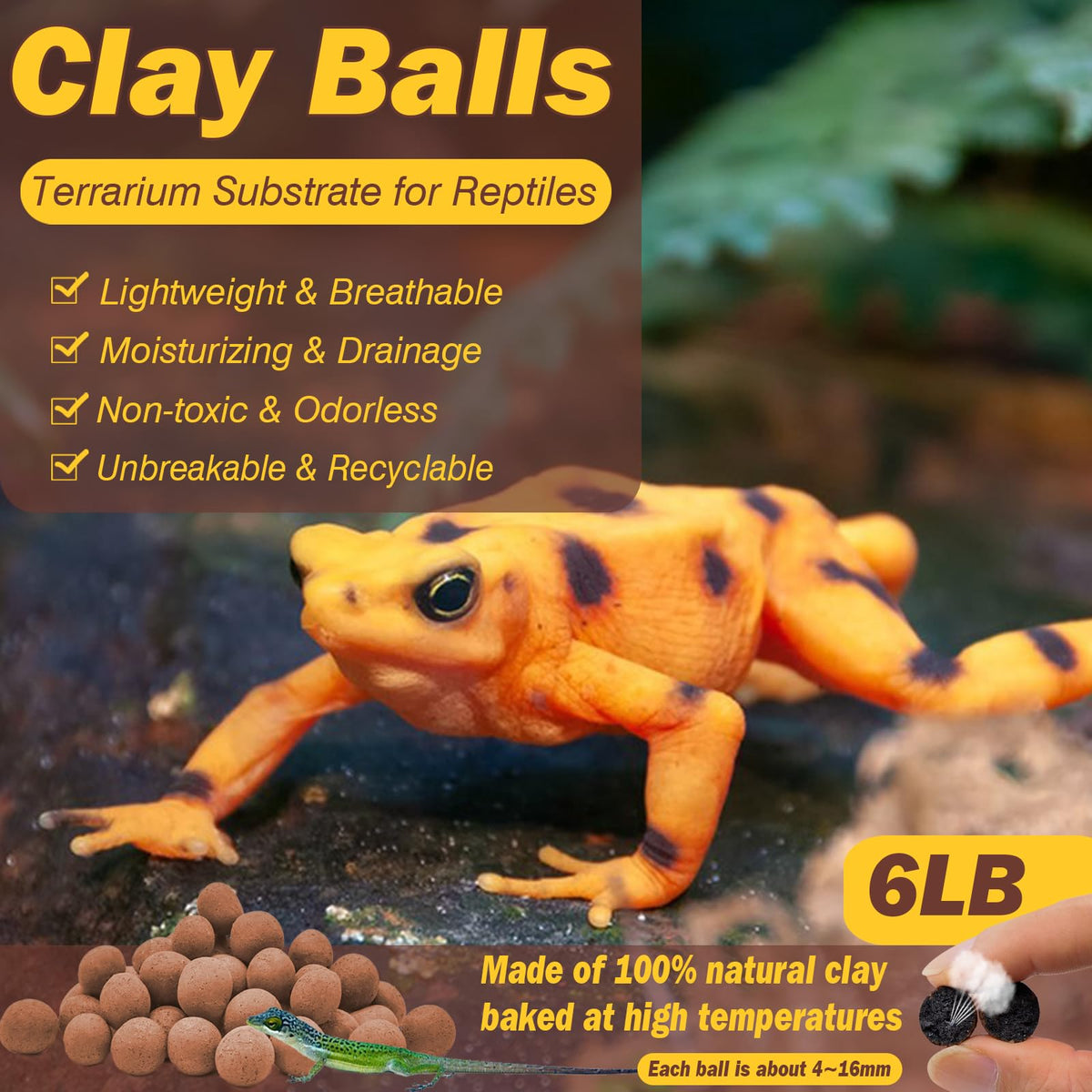 100% Natural Expanded Clay Pebbles for ReptilesSpecification:1)Packing includes: 1bag(6LBs).2) Material: 100% natural expanded clay pebblesFeatures: Lightweight Breathable Environmental Recyclable Used for:Suitable as a drainage layer for reptiles vivarium and as a growing medium for tropical plants