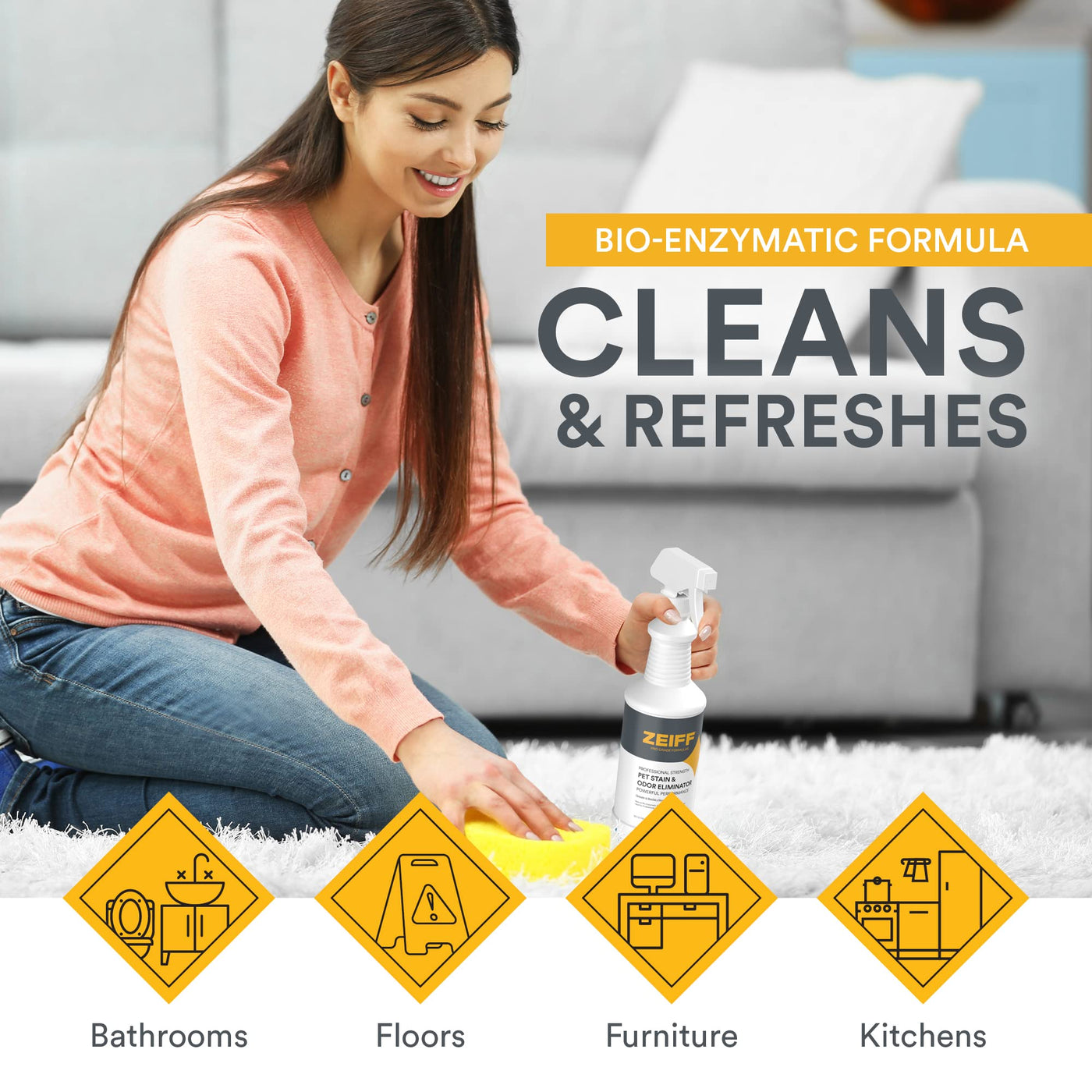 Banish bad odors and send stains packing. Zeiffs enzymatic Pet Stain and Odor Eliminator targets tough grimy stains and strong pungent odors at the source. From unsightly yellow urine spots and stink to doggy doo and drool, our pro grade cleaner eliminates the nastiness without a trace. Zeiff delivers powerful performance for professional and home use.FEATURES & BENEFITS:Multi-Surface SafeNo Caustics, Dyes or ParabenspH NeutralCruelty FreeMade in USAAvailable in Quart Spray Bottle or Gallon SizeZEIFF PET STAIN AND ODOR ELIMINATORIntroducing a proprietary pet odor solution that combines trusted fragrances and ingredients with a powerful live culture of odor-ending enzymes. The secret lies in Zeiffs proprietary formulation that breaks up complex organic proteins and tough stains, eliminating odors at the source. Unique enzymatic technology immediately binds and traps odors, freshening and ridding the room of pungent or lingering stains and stink from urine, feces, vomit, drool, blood, fluids, and pet smell.SAFE AND EFFECTIVEZeiff pet odor remover is biologically based and 100% safe for people, plants, animals, and furniture. It rapidly degrades stinky substances without causing harm to the environment. The only trace is a refreshing Fresh Breeze aroma. Contains zero chlorine or phosphates. Safe and effective to use on funky furniture, stinky leather upholstery, reeking carpets, stained hardwood floors, smelly pet beds and crates, dirty walls, slimy surfaces, diaper pails, garbage cans, bedding, laundry, artificial grass, litter boxes, and more.EASY TO USEA premium pet odor eliminator for home and professional use that relies on natural biology instead of harsh chemicals. Zeiff is effective on a variety of surfaces including fabric, tile, wood, glass, stainless steel, plastic, vinyl, and concrete. Easy to use. Shake bottle, test on an inconspicuous area.