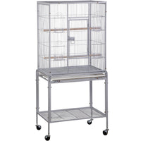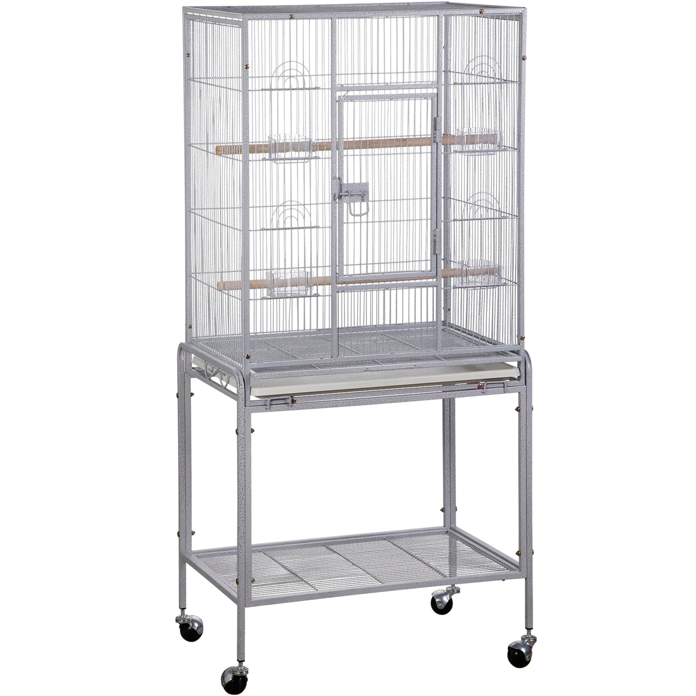 ZENY Bird Cage features one large front doors and a bottom shelf for additional storage space, this flight cage stands on rolling casters and is easily moved from room to room. Four plastic double cups and three wood perches are included in this economical extra large cage. Our bird cage is 25.2-inch long, 17-inch wide and 53-inch high with 1/2-inch wire spacing, makes the perfect home for multiple parakeets, canaries or finches FEATURES: Solid strong metal frame for years use Elaborately welded construction, strong metal wire that cannot be easily bent 1 interior long wooden perch for resting, higher view available Lower removable sliding tray for easy cleaning 4 feeding transparent cups for food and water 4 strong swivel casters for easy move and stability Reasonable bar space 0.5 inch ensures fly could not escape SPECIFICATION: Size: 25 (W) X 17 (D) X 53 (H) Material: Iron Overall Height Including Stand: 53 Bar Spacing: 1/2 Hight Without The Stand:30.7