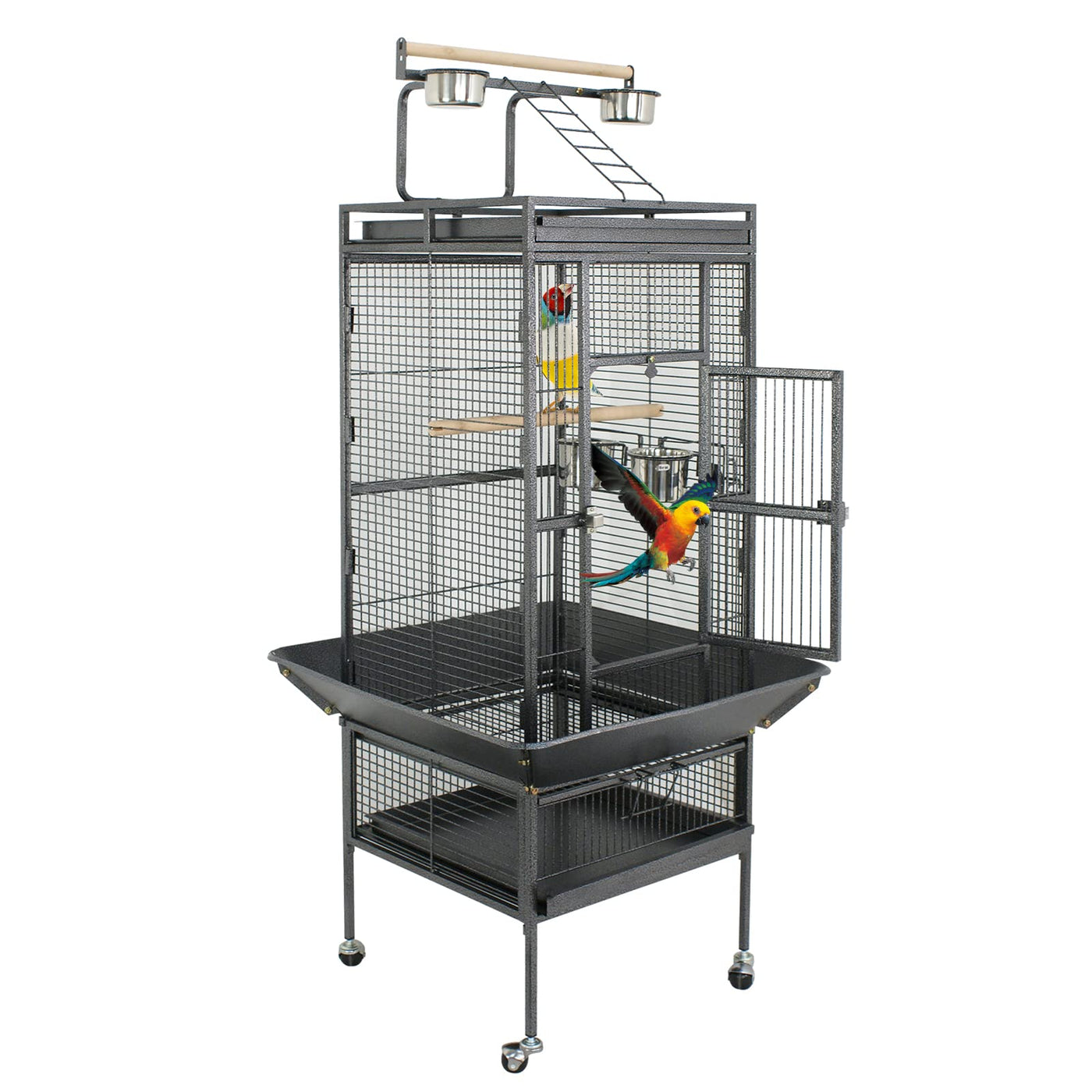ZENY Bird Cage features two wooden perches, heavy duty button lock, top playing area, handle design and heavy duty trays, 2 feeder doors, 4 rolling casters, removable tray. Our wrought iron bird cage is 25.6-inch long, 25.6-inch wide and 61-inch high with 1/2-inch wire spacing, makes the perfect home for multiple parakeets, canaries or finches and other similar size birds Recommended birds for this cage: Caiques Parakeets Parrotlets Budgies Canaries Cockatiels Smaller Conures Finches Smaller Cockatoos Poicephalus Pionus Jardines Parrot Red-bellied Meyer s Parrots Lories Mini Macaws other similar size birds Specifications Material: iron Cage Size: 45.8 x45.5 x83.5 cm/18 x17.9 x32.9inch (L x W x H) Total Size: 65 x65 x154 cm/25.6 x25.6 x61inch (L x W x H) Door Size: 43 x 22.5 cm/16.9 x 8.8inch (L x W x H) Bar Spacing: 1.2cm/0.5inch Two Small Bowl Diameters :10cm /3.9inch Two Large Bowl Diameters :10.5cm /4.1inch Base Tray Size:43 x 39 cm/16.9 x 15.4 inch G.W.: Approx 21.50 kg /47.4 LB Color: Black PACKAGE INCLUDES 1 x Cage Main Frame 1 x Ladder 2 x Metal Trays 2 x Wooden Perches 4 x Swivel casters 4 x Stainless Steel Bowls
