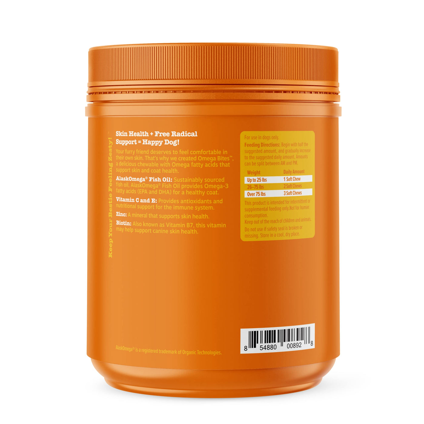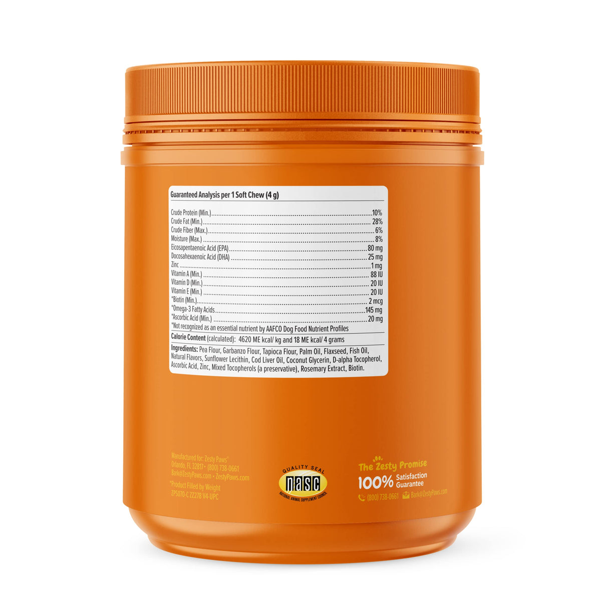 Zesty PawsA Omega Bites are soft, chewable supplements with natural ingredients that will keep your dog healthy from the inside out Featuring AlaskOmega, these delicious chicken-flavored soft chews are specifically formulated to feature rich Omega-3 fatty acid that provides vital nutrients for healthy skin and cardiovascular function This wellness supplement is the perfect canine soft chew for any age, breed, or size, while Vitamin E and Flaxseed Meal nourishes the coat and aids the digestive system to help dogs look and feel their best