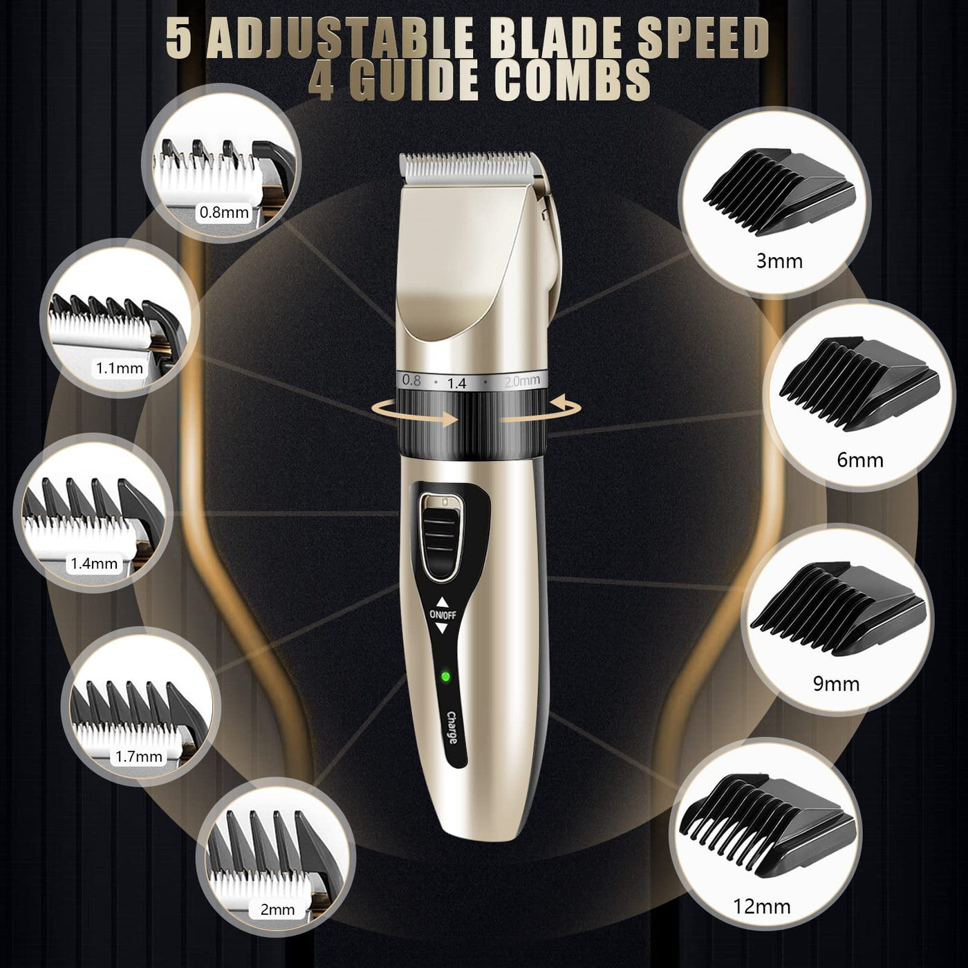 ?Adjustable & Sharp Blades?Dog clippers have 0.8mm-2.0mm Fine Tuning Knob and four attachment guide combs(3-13mm)for length control. This High Performancedog trimmer helps you get the suitable length for the pet coat