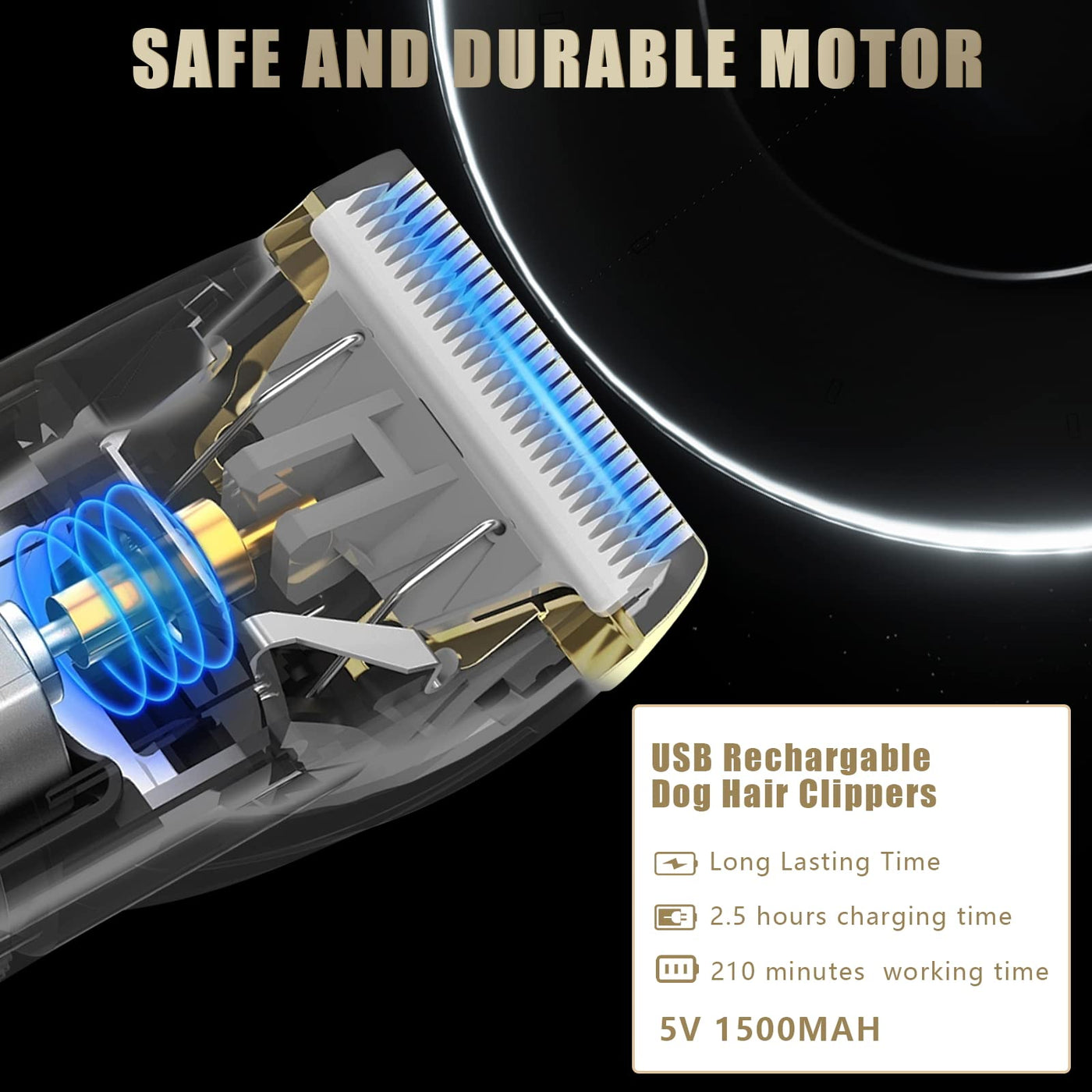 ?USB Chargeable & Cordless?The pet grooming kit is equipped with a USB charger. you don 't have to buy replacement batteries Lightweight and cordless design for easy use you can groom dogs outside and does not worry an extension cord