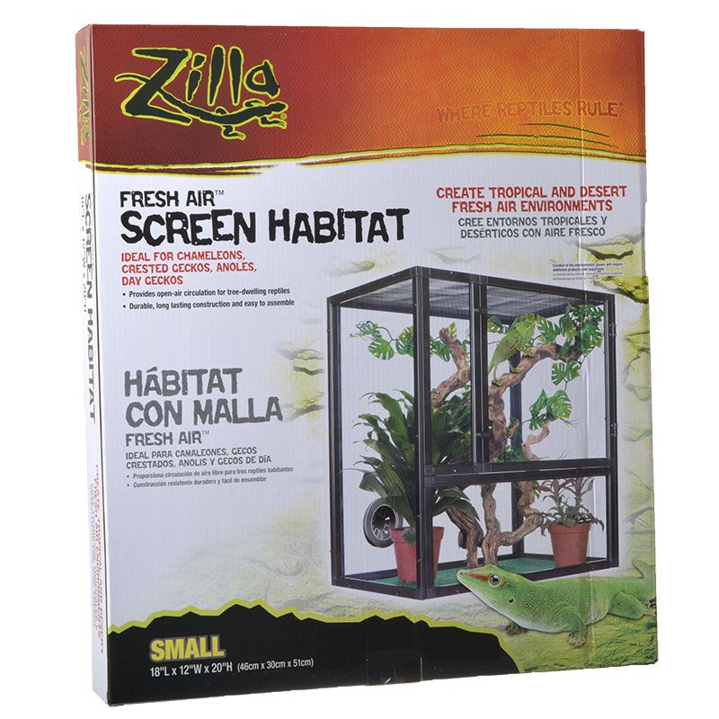 Q: What are the dimensions of the Zilla Fresh Air Screen Habitat for Reptiles?A: The Zilla Fresh Air Screen Habitat measures 18.0 inches in length, 12.0 inches in width, and is designed for small reptiles.