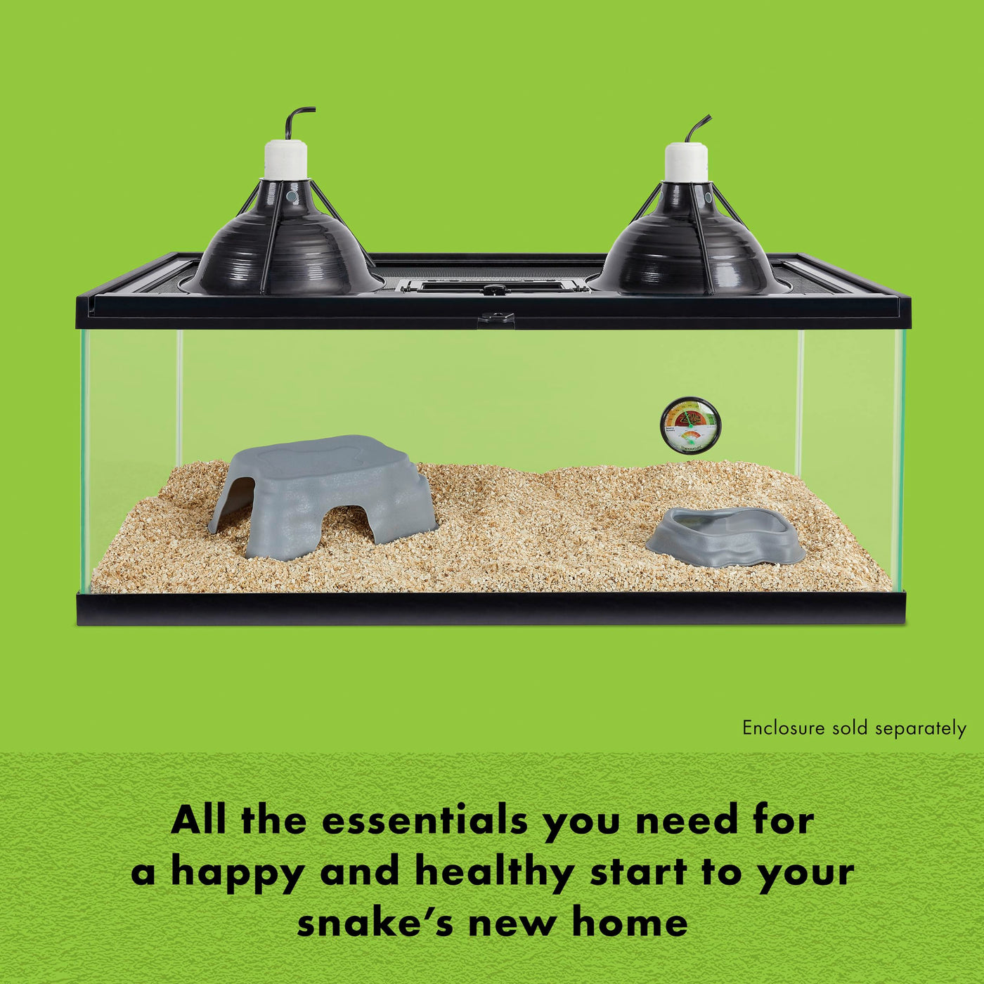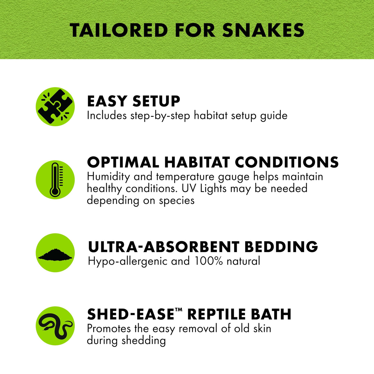 Set yourself and your new reptile up for success with the Zilla Habitat Accessory Kit. Designed to help you and your new reptile get off to a happy and healthy start, these starter kits feature the essential components your habitat will need. Each kit is catered to a different kind of habitat and the unique needs of the reptile or environment specified. The kits are available for tropical-dwelling reptiles, desert-dwelling reptiles, snakes, aquatic turtles and bearded dragons. Depending on the type of kit and the unique needs of the habitat, each kit will provide you with the essentials for lighting, heat and bedding, and may include a humidity and temperature gauge if the habitat requires. The Snake Habitat Accessory Kit comes with lighting, bedding, a humidity and temperature gauge, Shed-Ease Reptile Bath, a durable den and a feeding dish, providing a complete solution for creating a worry-free and optimal habitat for various types of snakes. There is also an easy step-by-step setup guide to help make setting up your pets habitat simple and stress-free. Pair the kit with the perfect enclosure that fits your snake and their needs for the perfect happy and healthy start to their new home. Celebrate your pet and Rep Yourself, with Zilla.