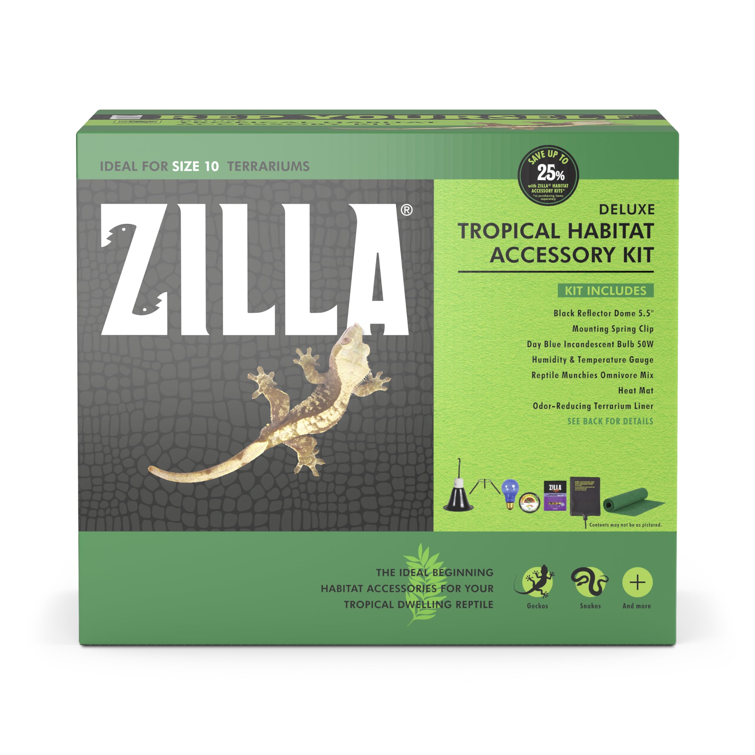 Set yourself and your new reptile up for success with the Zilla Habitat Accessory Kit. Designed to help you and your new reptile get off to a happy and healthy start, these starter kits feature the essential components your habitat will need. Each kit is catered to a different kind of habitat and the unique needs of the reptile or environment specified. The kits are available for tropical-dwelling reptiles, desert-dwelling reptiles, snakes, aquatic turtles and bearded dragons. Depending on the type of kit and the unique needs of the habitat, each kit will provide you with the essentials for lighting, heat and bedding, and may include a humidity and temperature gauge if the habitat requires. The Tropical Habitat Accessory Kit comes with lighting, heat, bedding, a humidity and temperature gauge, food and a feeding dish, providing a complete solution for creating a worry-free and optimal habitat for juvenile tropical-dwelling reptiles. There is also an easy step-by-step setup guide to help make setting up your pets habitat simple and stress-free. Pair the kit with the perfect enclosure that fits your reptile and their needs for the perfect happy and healthy start to your reptiles new home. Celebrate your pet and Rep Yourself, with Zilla.