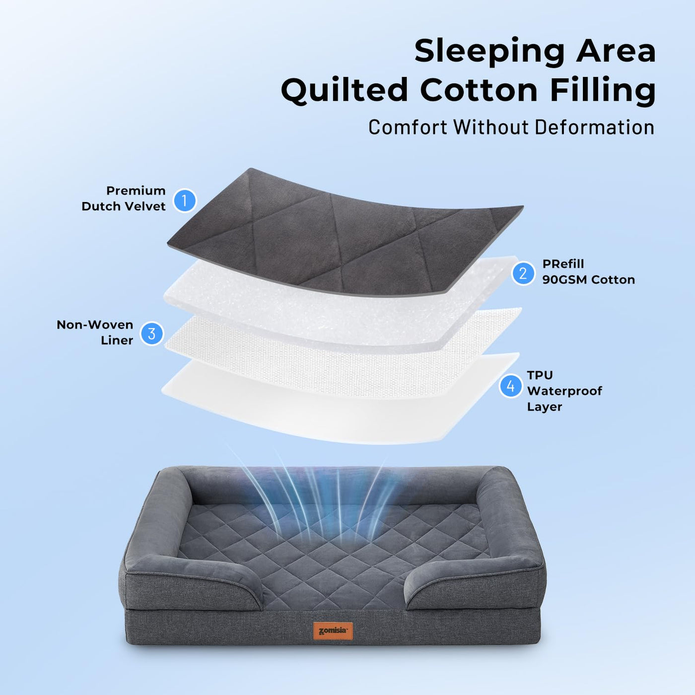 High-Quality Egg Crate Foam:Zomisia Orthopedic Dog Sofa Has High-Density Egg-Crate Foam Helps Distribute Weight Evenly And Provides The Perfect Amount Of Pressure Relief And Joint Support Strong Support:The Dog Bed With Sides Is Designed To Make The Dog Feel Safe. The Stuffed 3D Pp Cotton Provides Support For The Dog'S Head And Neck, As If Lying In Its Mother'S Arms. This Dog Bed Can Provide A Comfortable Sleep For Dogs Of All Weights Luxurious Fabric And Stylish Design:The Surface Is Made Of High Quality Dutch Velvet, Which Is Comfortable To The Touch. The Material Is Gentle On The Skin, Nose And Paws Non-Slip Bottom:This Extra Large Dog Bed Has Non-Slip Rubber Particles At The Bottom, Which Can Be Fixed To The Floor To Ensure That The Dog Will Not Slide Easily When Playing Or Sleeping On The Extra-Large Dog Bed Easy Care:The Zipper Design Makes The Cover Of The Dog Bed Easy To Remove And Can Be Cleaned Directly Using The Washing Machine, Taking Care Not To Wash The Foam