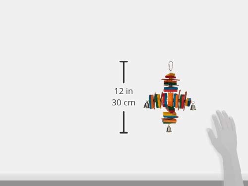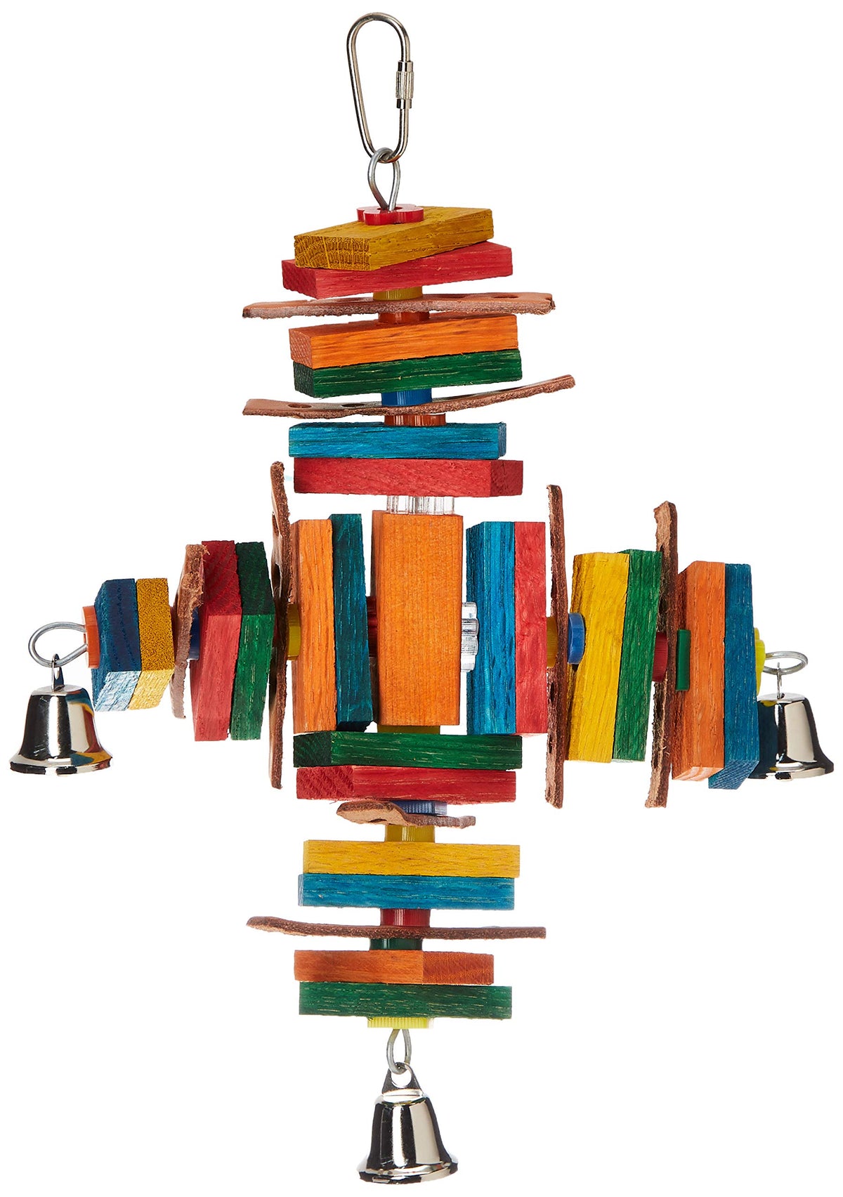 Radar Bird Toy keeps feathered pets busy with various brightly colored wood pieces leather strips and multiple bells for added stimulation. All the colorful pieces are colored with non-toxic dyes.