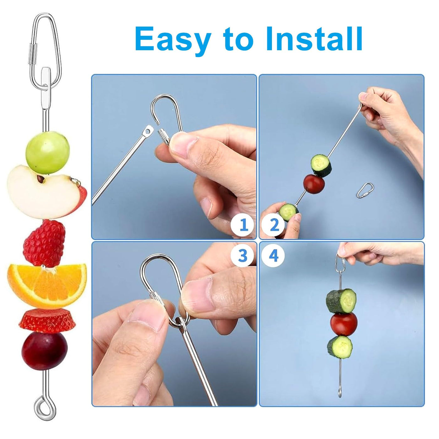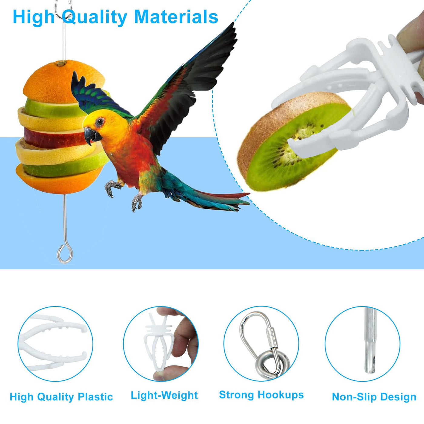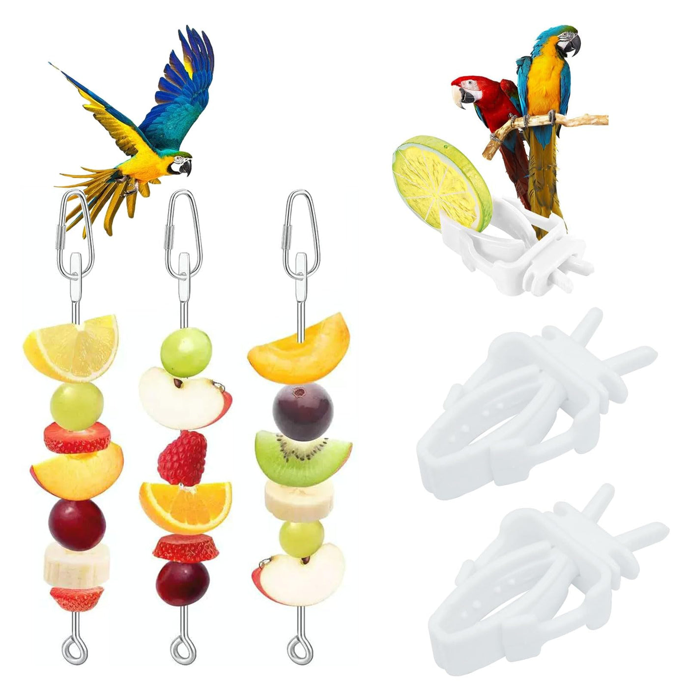 Specifications:Package Includes: 3 x Parrot Fruit Vegetable Skewe3 x Bird Food ClipsMaterial: 304 Stainless Steel, thickened resin plasticSize:Parrot Fruit Vegetable Skewe: 10.47InchesBird Food Clips: 2.32 x 1.11 x 0.52 inchesWarm Reminder:1. Due to the difference between monitors, there may be a slight color difference.2. Due to manual measurement, the size and weight may have a certain error.