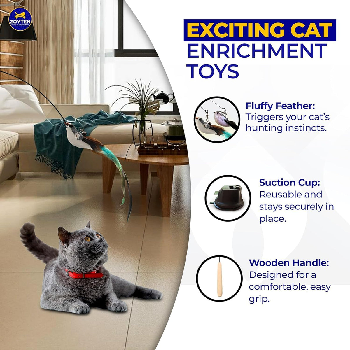 Zoyten 10Pcs Wand Toy Set - Interactive Teaser With Feather Refills, Suction Cup & Fishing Pole, Retractable Toy For Indoor Cats