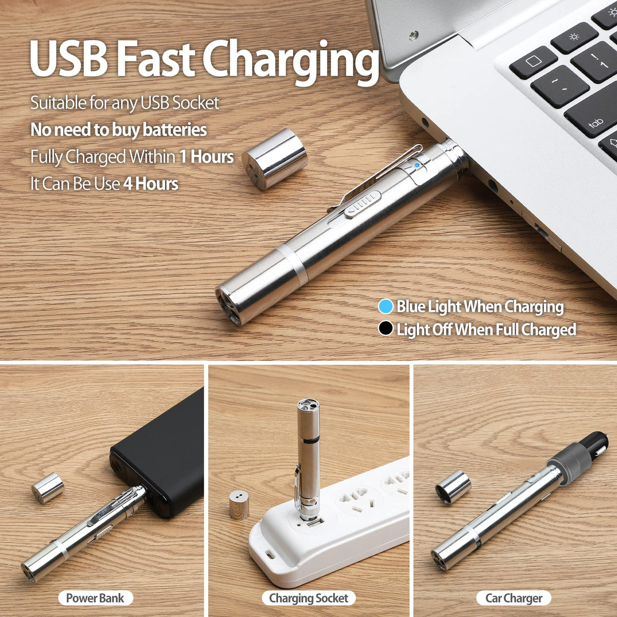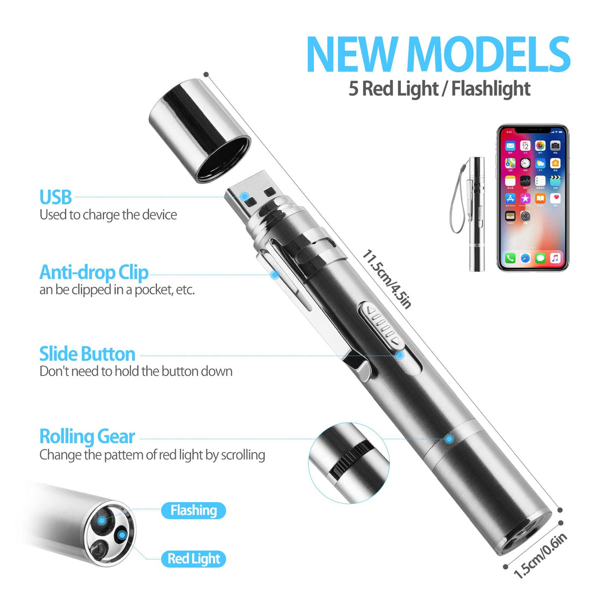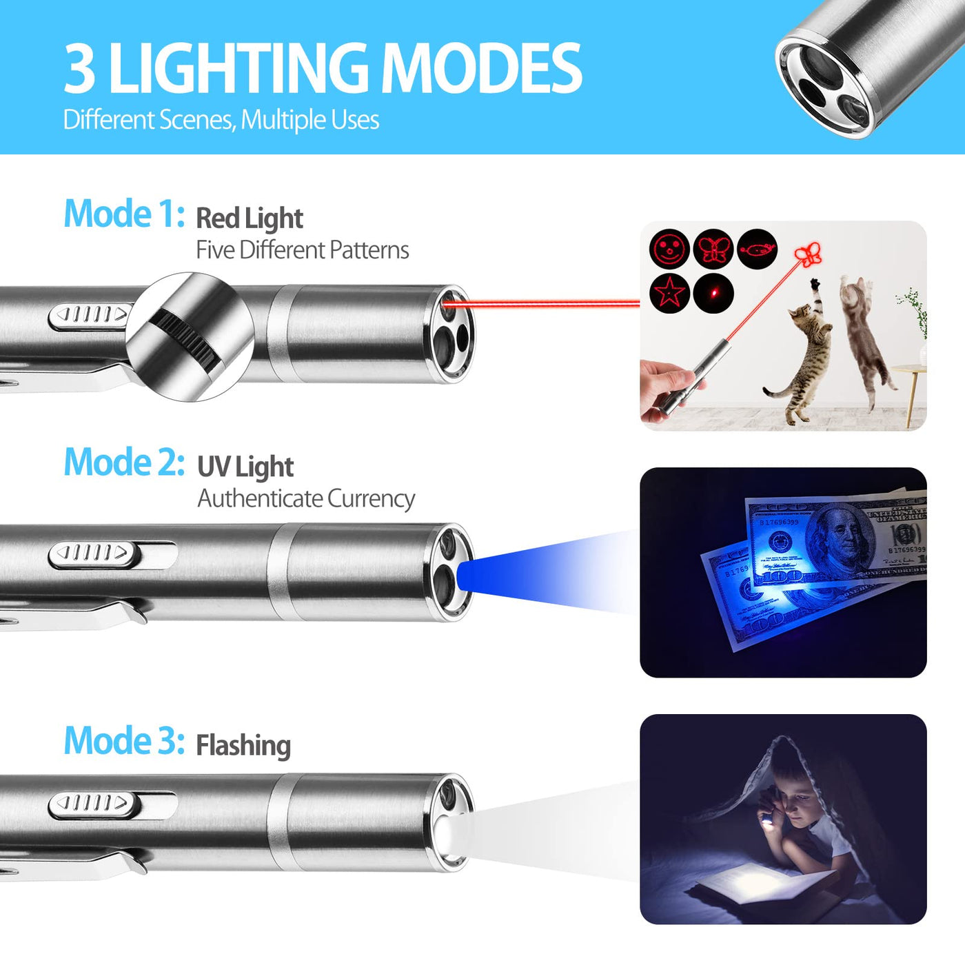 Any USB charging]: No need to replace the battery The blue indicator light will be on when charging and it will be off when fully charged MULTIPLE FUNcTIONS]: 3 different color modes (Red Purple White) 5 patterns (Point Mouse Smiling face Butterfly Star) HIgH-QUALITY]: Stainless steel shell sturdy and durable Easy to carry]Mini cat toys easy to carry can easily put in your pocket or bag replenish the use anytime anywhere EXcELLENT PET TOYS]: Easy to use cat and dog toys for indoor can be used as interactive toy for pet toy training sports and entertainment to satisfy your cat and dogs curiosity and endless fun great choice to keep pets entertained and play with pets while sitting on a chair
