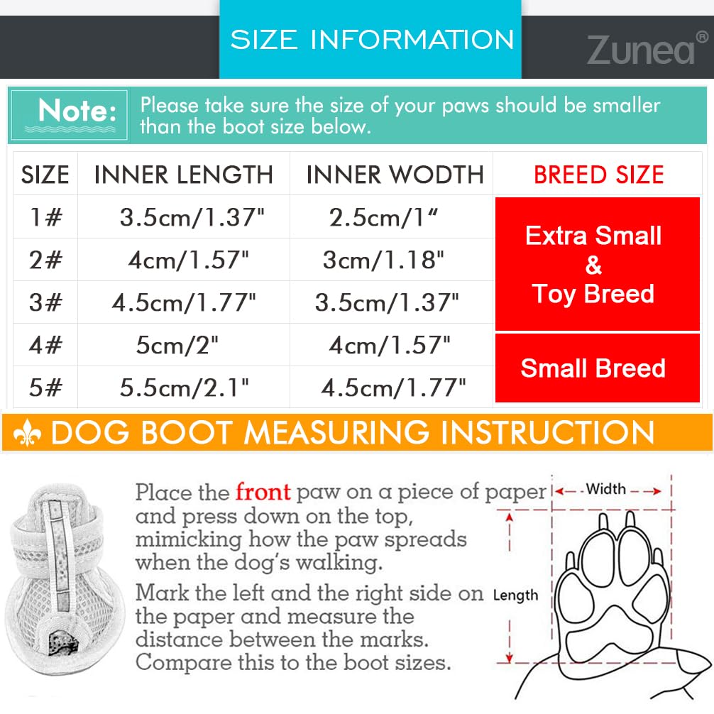 Q: Are these dog shoes suitable for all dog breeds?A: The Zunea Summer Dog Shoes are designed for small dogs, like Chihuahuas, but can be suitable for any small breed. Just ensure you select the correct size by measuring your dog's paw according to our sizing chart.